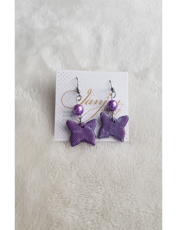 Viseči uhani Janjin sijaj so unikatni in ročno narejeni. So imitacija jeans/a v podobi metuljčkov, ki jih krasi perla v vijolični barvi. Narejeni so iz polimerne mase v vijolični barvi.