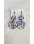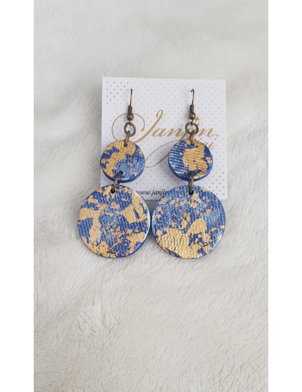 Viseči uhani Janjin sija so imitacija jeansa. Narejeni so iz polimerne mase, ki jo krasijo delčki v zlati barvi.