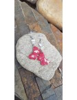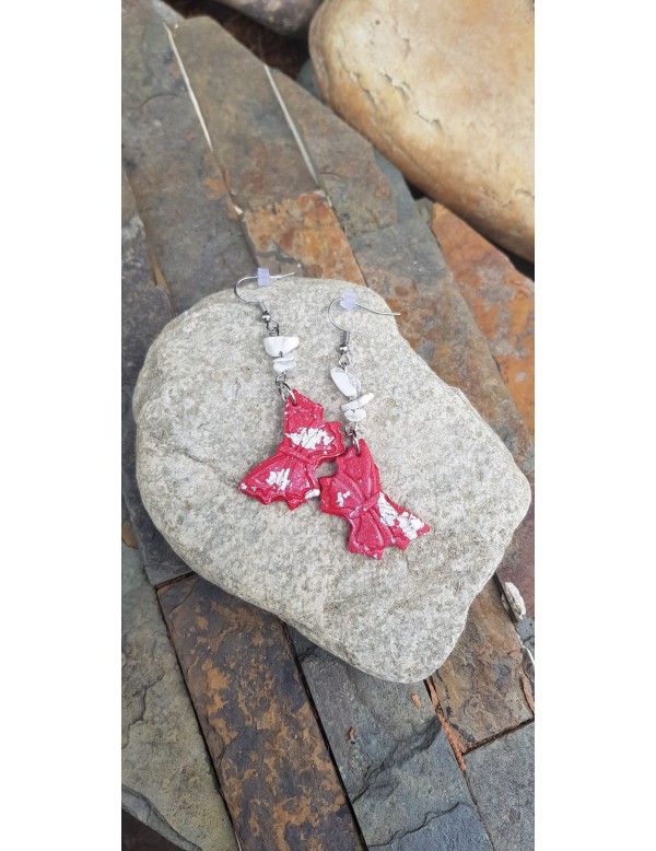 Narejeni so iz polimerne mase v rdeči barvi. Uhani so v obliki metulja, ki jih krasijo drobni kamenčki v beli barvi in drobni delčki v srebrni barvi.