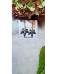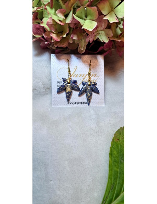 Ročno narejeni uhani Janjin sijaj (Narava). Čudoviti uhani s pridihom narave - listja, narejeni iz polimerne mase v temno modri barvi, v katero so ujeti lističi v zlati barvi. Uhani so elegantni in dovolj veliki, da z njimi zasije vsaka dama.