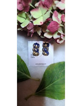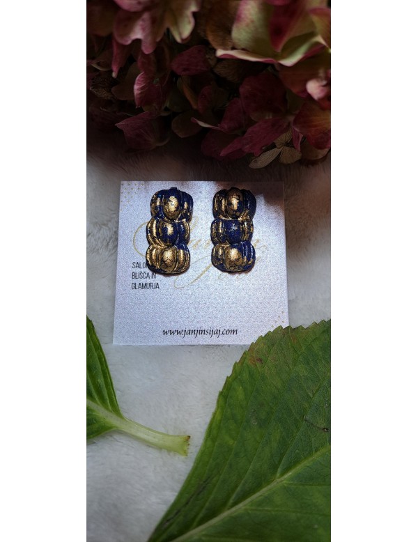 Ročno narejeni uhani Janjin sijaj (Buča). Čudoviti uhani s pridihom narave - buč, narejeni iz polimerne mase v temno modri barvi, v katero so ujeti lističi v zlati barvi. Uhani so elegantni in dovolj veliki, da z njimi zasije vsaka dama.