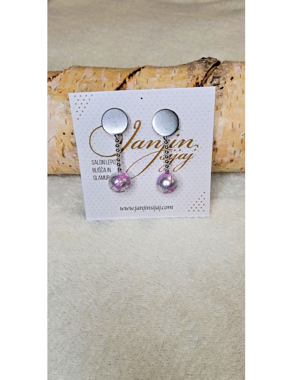 Uhani Janjin sijaj (Srebrna eleganca) so ročno narejeni uhani. Čudoviti, viseči, elegantni in opazni uhani narejeni iz polimerne mase v nežno vijolični barvi, ki je prekrita z delčki v srebrni barvi. Uhane še dodatno poudarijo dodatki v srebrni barvi.